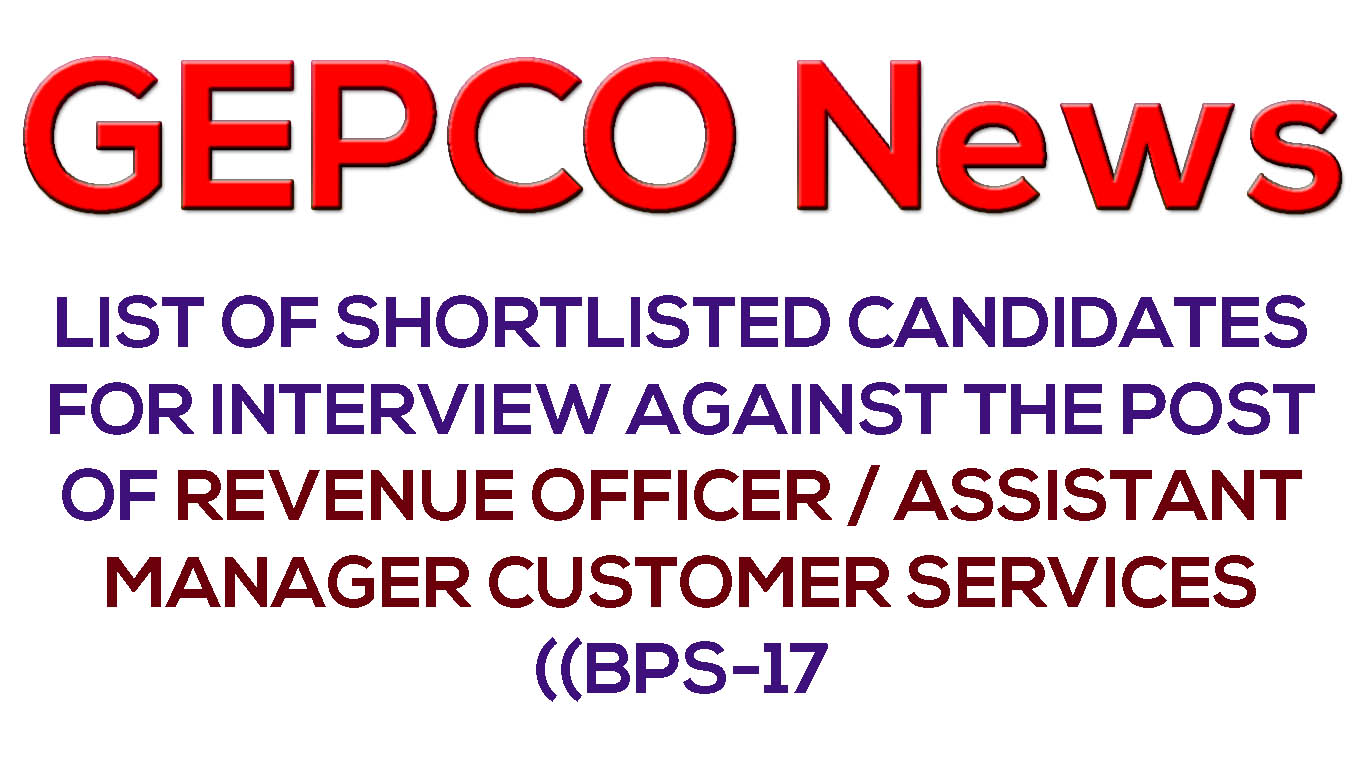 LIST OF SHORTLISTED CANDIDATES FOR INTERVIEW AGAINST THE POST OF REVENUE OFFICER / ASSISTANT MANAGER CUSTOMER SERVICES (BPS-17)